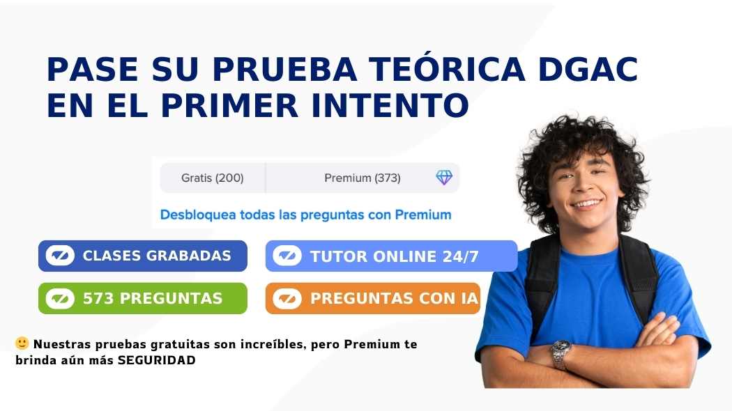 ¡Estarás bien! Premium está diseñado para una preparación rápida y efectiva. Destacamos los temas más cruciales y coincidimos con el formato de examen DGAC, por lo que incluso si tiene poco tiempo, puede construir rápidamente el conocimiento que necesita. Nuestro plan Express de 7 días es perfecto para los que se quedan de última hora.