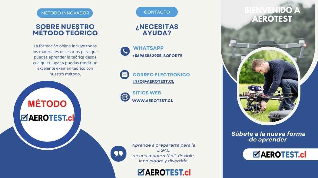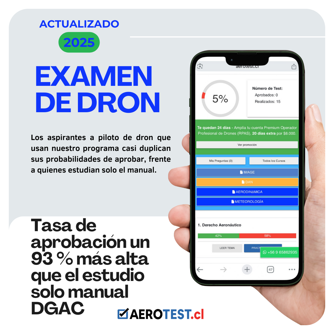 Los aspirantes a piloto de dron que se preparan en Aerotest.cl casi duplican sus probabilidades de aprobar, frente a quienes estudian solo el manual en pdf. Nuestra plataforma combina teoría oficial, simulaciones de examen y evaluaciones personalizadas que refuerzan cada aprendizaje. Así, llegas al examen con seguridad, práctica real de las preguntas y una comprensión mucho más sólida de los contenidos..